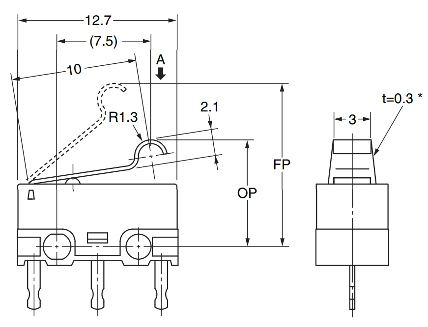 MIKROSVITČS 3A/125V, 2A/30VDC, 12,8x5,8x6mm, IP40, D2F-L3-A1 OMRON