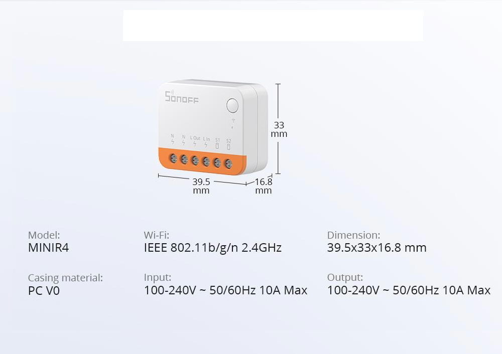 Materiāls: PVC0 Darba temperatūra: -10~40°C Darba mitrums: 5% - 95% bez kondensācijas Balss vadība: Amazon Alexa, Google Home un Siri Mobilā lietotne: eWeLink Izmēri: 39,5 x 33 x 16,8 mm Saziņas protokols: Wifi Kanālu skaits: 2 Ieejas jauda: AC 100–240 V 50/60 Hz 10 A maks. Izejas jauda: AC 100–240 V 50/60 Hz 10 A maks.