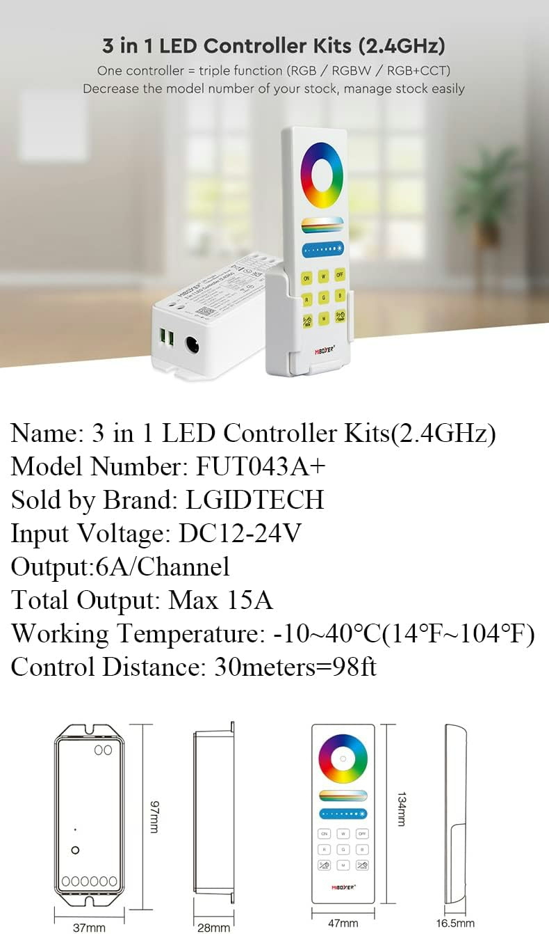 Bezvadu 3in1 kontrolieris FUT043A ir paredzēts RGB/RGBW/RGB+CCT LED sloksnēm ar elegantu bezvadu skārienpaliktni. Kompakts, viegli uzstādāms, universāls lietošanai jebkurā instalācijā. Viegli lietojamā tālvadības pults, kas sazinās ar kontrolieri Wi-Fi 2,4 GHz diapazonā, nodrošina darbības attālumu līdz 30 m. Tālvadības pults vai viedtālruņa lietotne (nepieciešams instalēt Miboxer APP uz WL-BOX1 un Wi-Fi interfeisu) no jebkuras vietas.