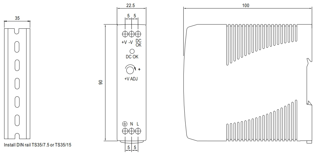 Mean Well MDR-20 sērijas rūpnieciskā DIN barošanas avots, kas viegli uzstādāms uz DIN sliedes.