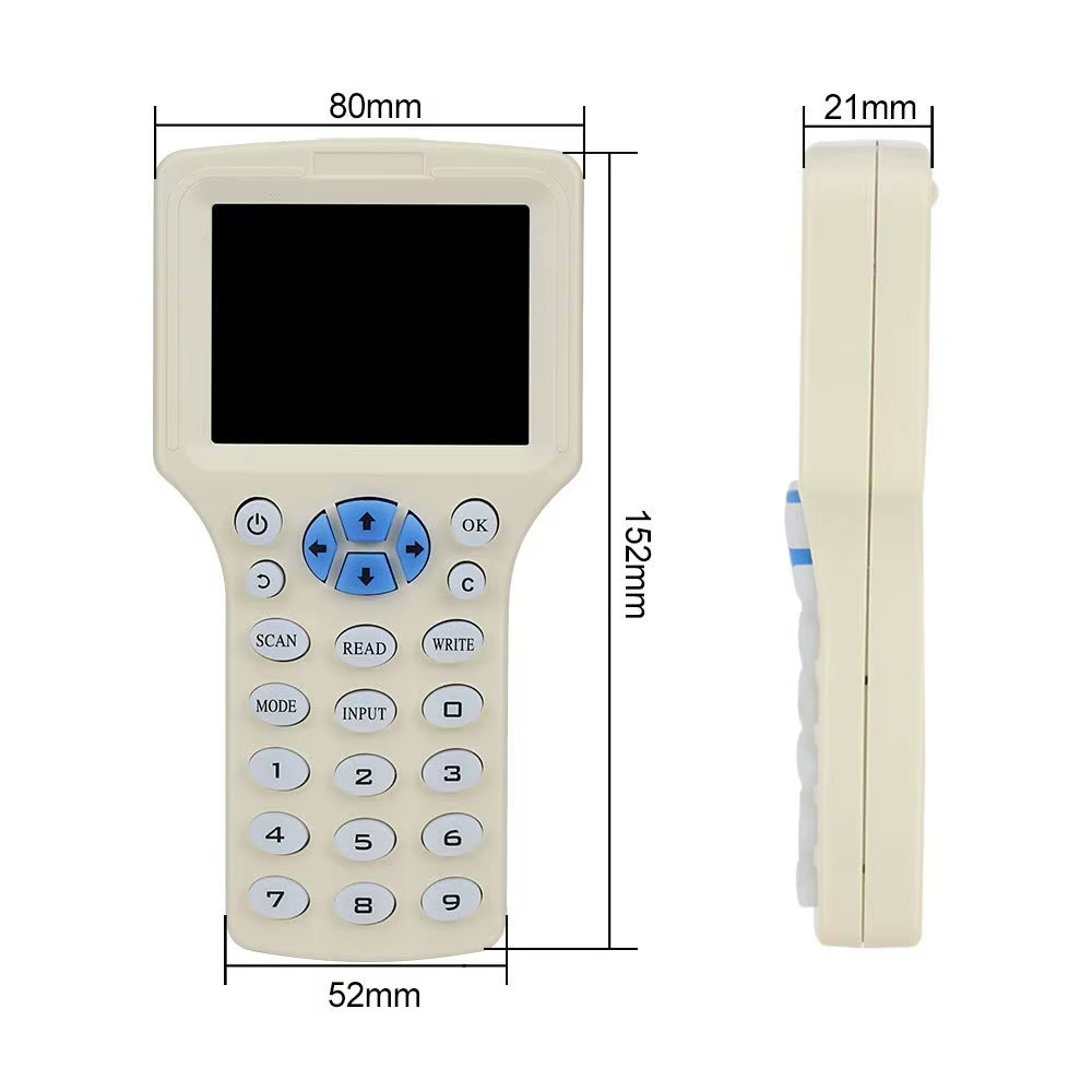 RFID IC/ID kopēšanas un nolasīšanas ierīce 125 kHz – 13,56 MHz kartēm ar LCD 3,2 collu displeju (iekļauts kartes/atslēgas/piekariņa komplekts)