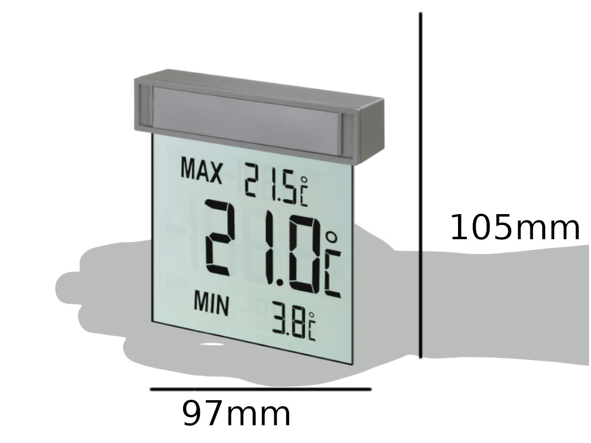 Uzzināt par laika apstākļiem ārā nevar būt vienkāršāk! Ar TFA VISION ārējā temperatūra lielos ciparos tiek praktiski parādīta tieši uz loga stikla. Plakans, viegls un elegants termometrs tiek piestiprināts pie loga ārpuses, un temperatūru var viegli nolasīt no telpas iekšpuses. Tiek parādītas dienas augstākās un zemākās vērtības, kas tiek automātiski atjauninātas katru dienu.
