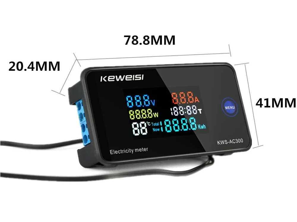 KWS-AC300 ir slēgta serdeņa maiņstrāvas transformators, kas ļauj izmērīt strāvas parametrus. Mazs LCD displejs parāda datus, kas norāda spriegumu un strāvu, temperatūru, darbības laiku un kWh patēriņu. Maksimālā strāvas mērījumu vērtība ir 100 A, mērāmais spriegums ir no 50 V līdz 300 V maiņstrāvai.