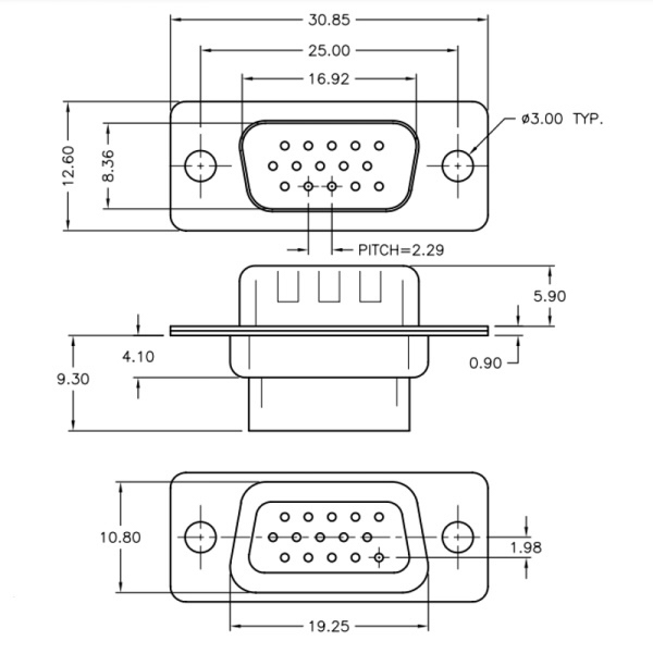 Korpusa izmēri ir balstīti uz standarta D-Sub spraudņa savienotāja kontaktu skaitu (piemērs: 15 kontaktu augstas blīvuma spraudņa savienotājs, kas iederas 9 kontaktu korpusā).