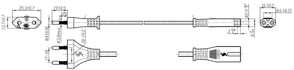 Universāls strāvas kabelis ar taisniem spraudņiem stabilai strāvas padevei Piemēram, televizoru, klēpjdatoru strāvas padeves, radioaparātu, kasešu magnetofonu, klēpjdatoru, plakanu ekrānu utt. pieslēgšanai.