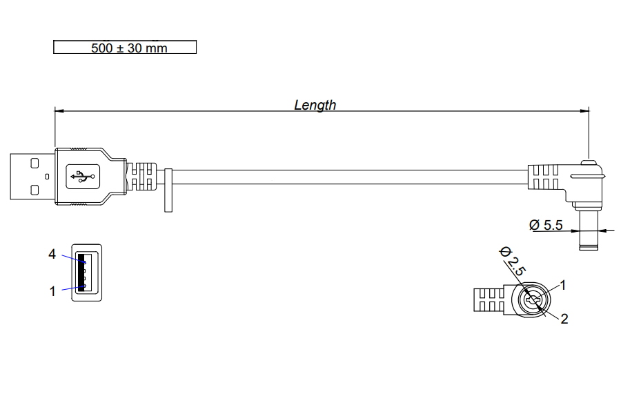 USB-A (K) <-> 2,5/5,5 mm DC leņķveida spraudnis, 0,5 m