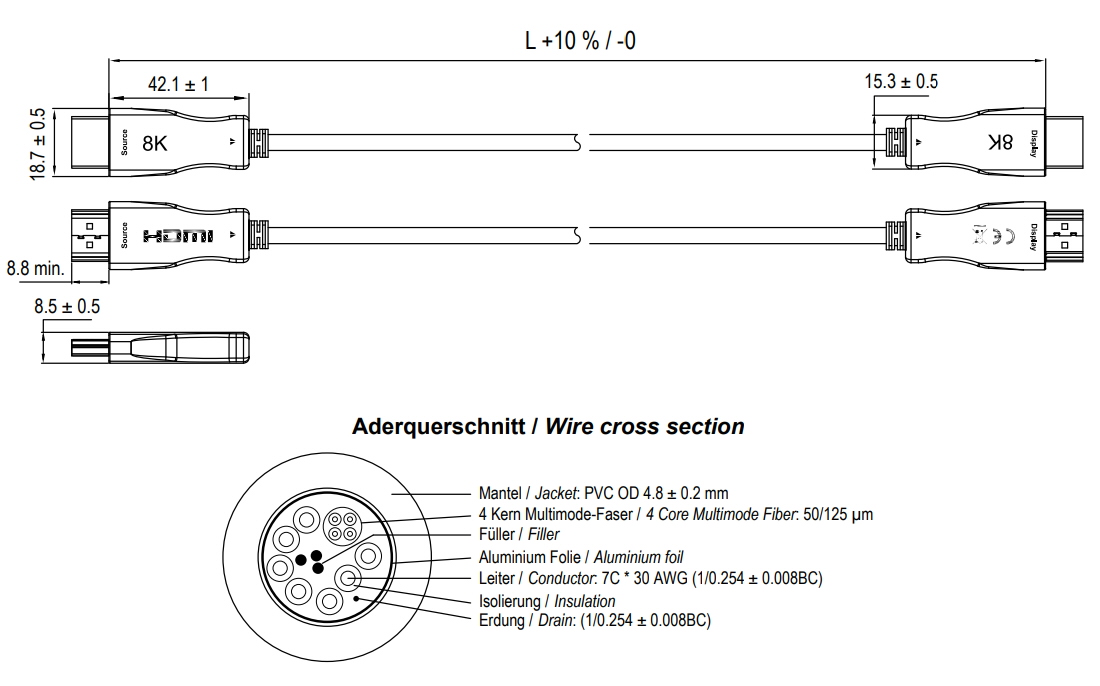 3D8K AOC kabelis (Active Optical Cable) ar HDMI™ savienotājiem un hibrīda optiskā šķiedra vara vadītājs, kas nodrošina pārraides bez