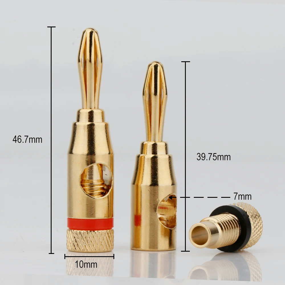 Zelta pārklājuma banānu spraudņi ar stilīgu sarkanu un melnu identifikācijas gredzenu. Ātra uzstādīšana ar iespiežamu skrūvi, kas ļauj viegli piestiprināt pie skaļruņu vadiem. Šie smagie, bet kompakta izmēra banānu spraudņi ir ideāli piemēroti savienojumiem, kur nepieciešams aizmugurējais savienojuma spraudnis. Piespraudes rotējošā atsperes daļa ļauj tai droši rotēt, kad tā ir ievietota, ļaujot vadu noliekt vēlamajā virzienā. Vada savienojuma punkts atrodas diezgan tuvu pašai piespraudei, tādējādi kopējais garums ir mazāks. Iekšējais virzulis droši saspiež vadu un arī novērš vītnes nogriešanu skaļruņa vadā. Piespraude ir plug-in tipa, tādējādi divus skaļruņa vadus var savienot ar vienu termināli, savienojot tos kopā.