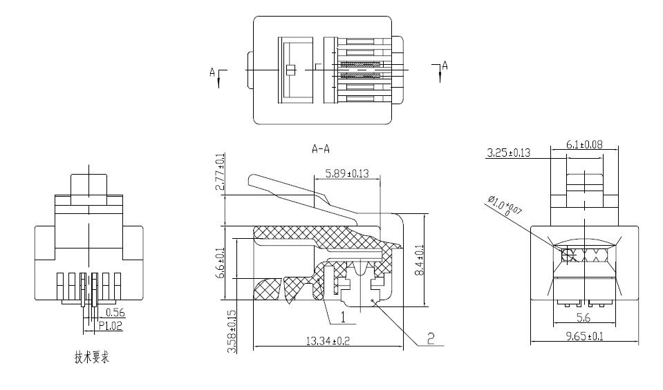 Neekranēts 6P2C spraudnis montāžai uz plakaniem telefona kabeļiem Plakana