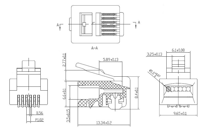 Neekranēts 6P6C spraudnis montāžai uz plakaniem telefona kabeļiem Plakana