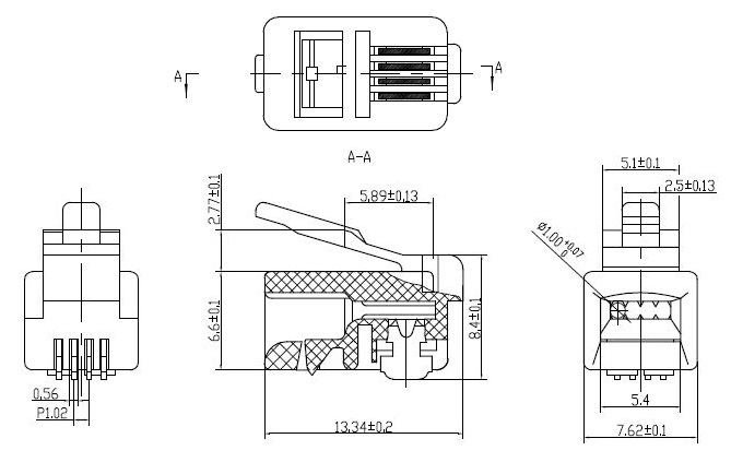 Neekranēts 4P4C spraudnis montāžai uz plakaniem telefona kabeļiem Plakana