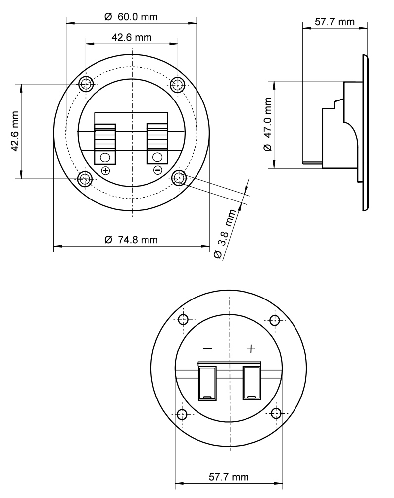 savienojumuFiksēšanas caurumu attālums: 42,6 mm, ārējie izmēri: 74,8 mm plats, 57,7 mm