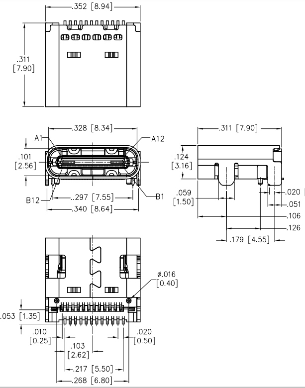 USB-C ligzda, SMT, 90° leņķveida, USB 3.1