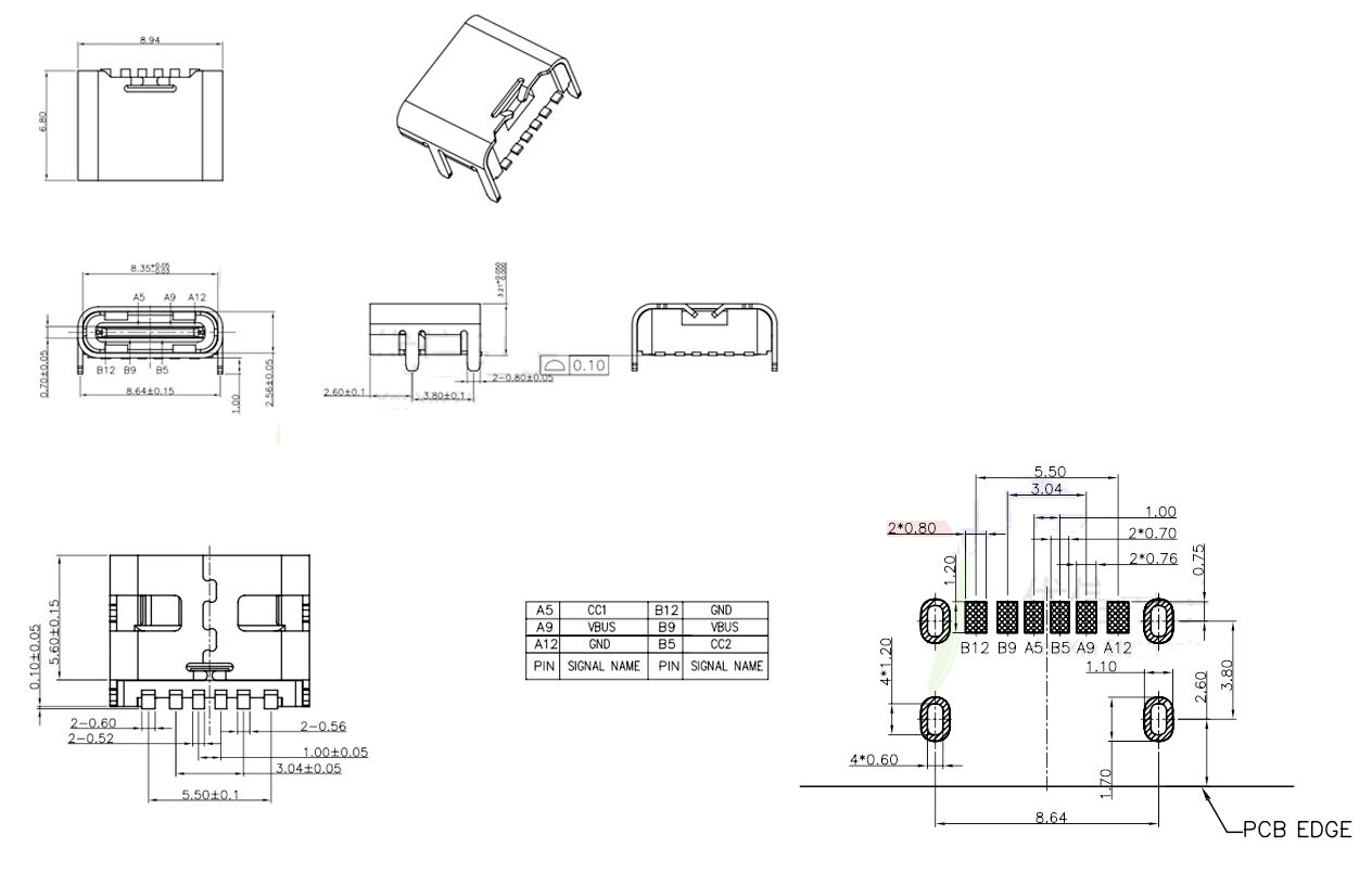 USB C ligzda, SMT leņķveida 90°, 6 kontakti