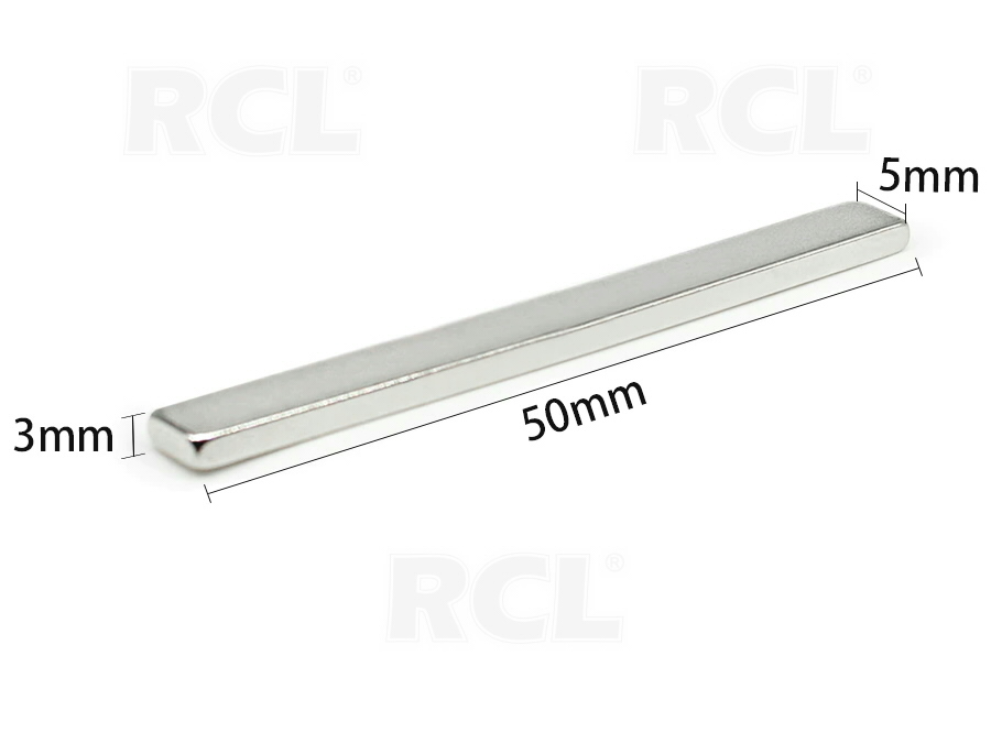 Materiāls: neodīms, N35 Pārklājumi: niķelis + varš + niķelis + trīskāršs pārklājums Pielaide: 0 ~ 1 mm Izmēri: 50x5x3mm