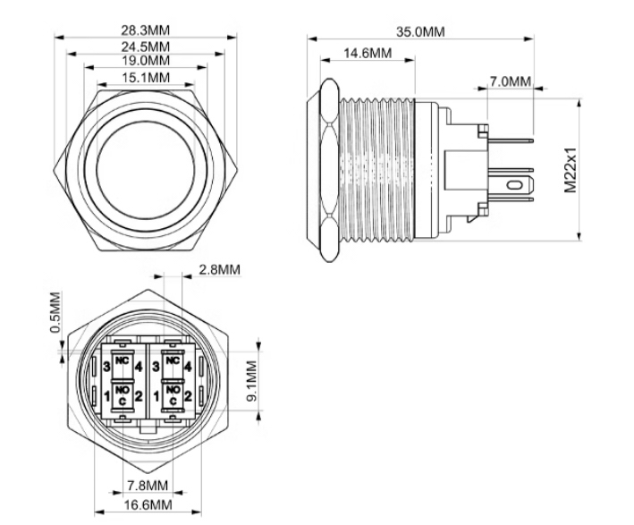 SPIEDPOGA IZSLĒGTA (IESLĒGTA) 250 V maiņstrāva, 3 A, ø22 mm, IP67, ar sarkanu LED indikatoru