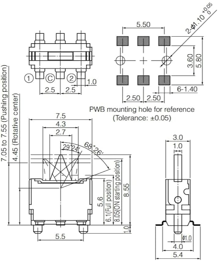⚙️ Tehniskie parametri* Modelis: ESE24MV1T * Ražotājs: Panasonic * Slēdža tips: momentāns (IESLĒGTS)-IZSLĒGTS-(IESLĒGTS) * Montāžas tips: virsmas montāža (SMD) * Izmēri: 7,5 mm x 8,55 mm x 3 mm * Kontaktu skaits: 4 * Nominālā strāva: 100 mA pie 12 V DC * Izolācijas pretestība: ≥ 100 MΩ (pie 100 V DC) * Dielektriskā izturība: 250 V maiņstrāva, 1 min * Maksimālā kontaktu pretestība: ≤ 100 mΩ * Darbības spēks: ~3,5 N * Dzīves ilgums: līdz 100 000 darbības cikliem * Darba temperatūra: no -40 °C līdz +85 °C * Indikācija: mehāniska (vizuāla)📘 Lietojumi* Tālvadības pultis * Rūpnieciskās vadības sistēmas * Pārnēsājamās elektroniskās ierīces * Medicīnas iekārtas🏷️ Papildu informācija* Atbilst RoHS ✅ * Bez halogēnu dizains ♻️--------------------