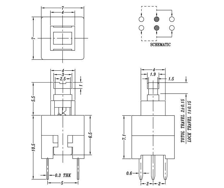 PUSH BUTTON SWITCH ON-OFF 0,1 A / 30 VDC 7 x 7 mm l = 2 x 3 mm