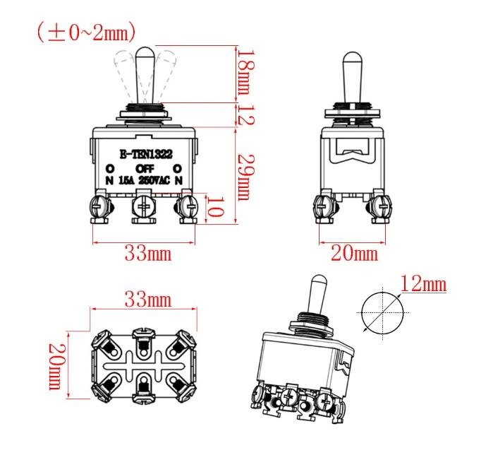 ,2 mm Pārslēgšanas pozīcijas: 2 pāru kontakti ON-OFF-ON