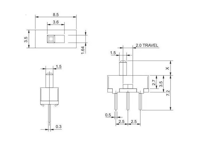 SLIDE SWITCH 0,3 A 50 V, 3-pin 2 pozīcijas, ON-ON