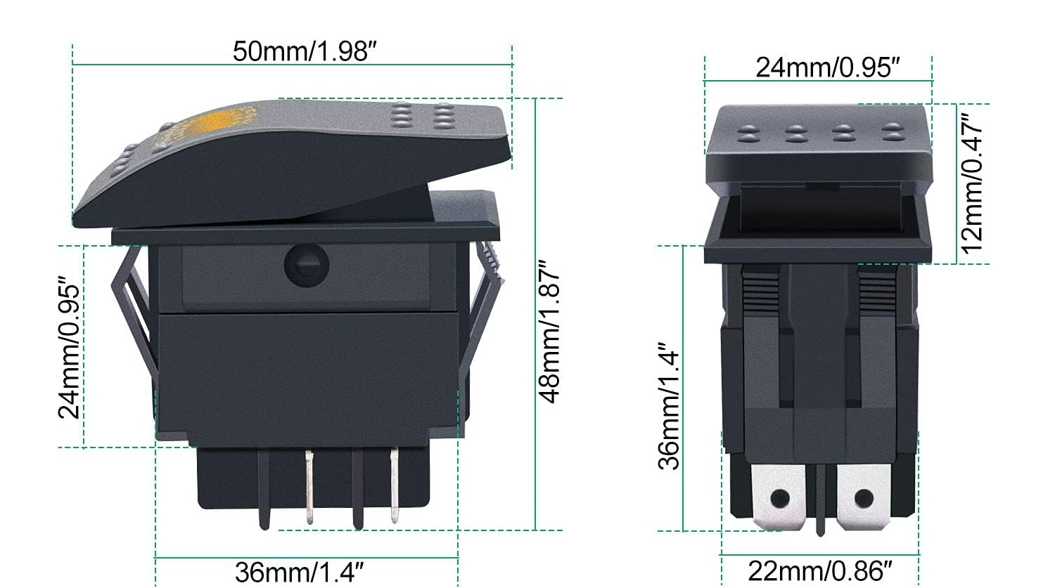 Ūdensizturīgs ON/OFF taisnstūra slēdzis ar sarkanu apgaismojumu, piemērots 12V un 24V līdzstrāvas lietojumiem.