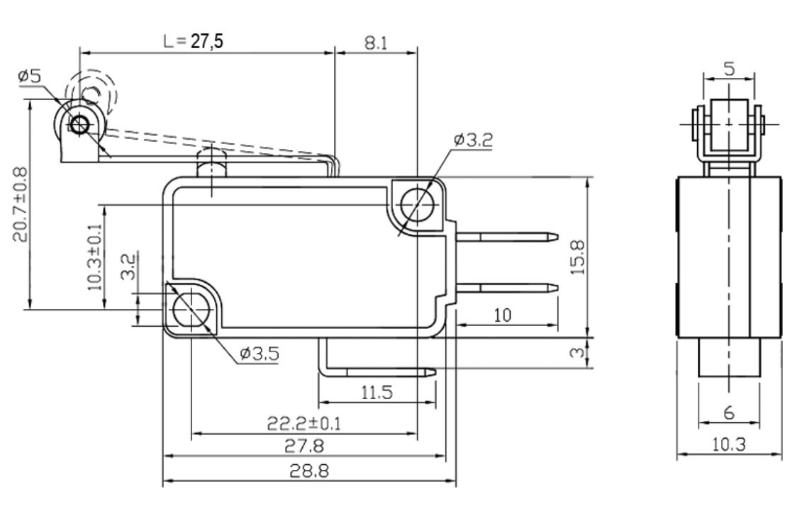 MIKROSVITČS IESLĒGTS (ON), 15 A/250 V, ar 12 mm garu rullīša sviru, 16 x 28 x 10,3 mm