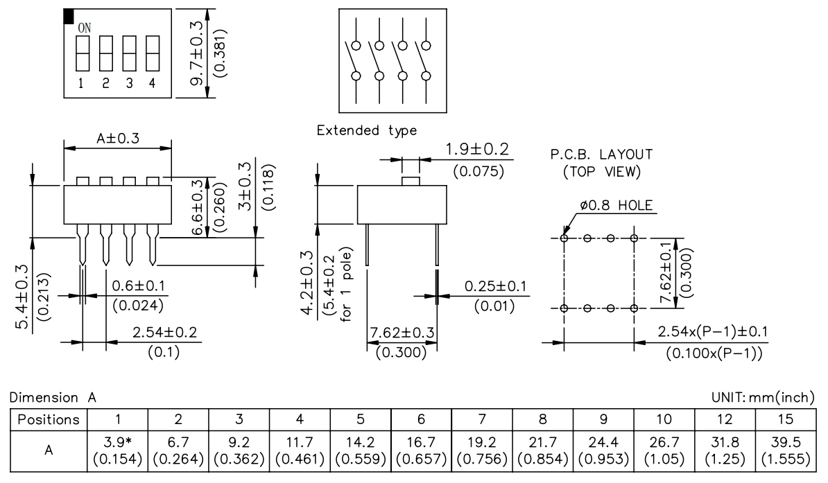 DIP-SWITCH slēdzis – izmēri analogi DIP integrālajai shēmai.