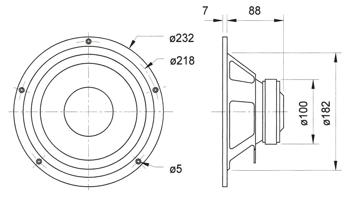 20 cm (8") HiFi zemfrekvences skaļrunis ar spēcīgu piedziņu, pagarinātu aizmugurējo polu plāksni un 35 mm balss spoļu augstas jaudas pārvaldībai. Elastīga gumijas apmale un pārklāts papīra konuss.