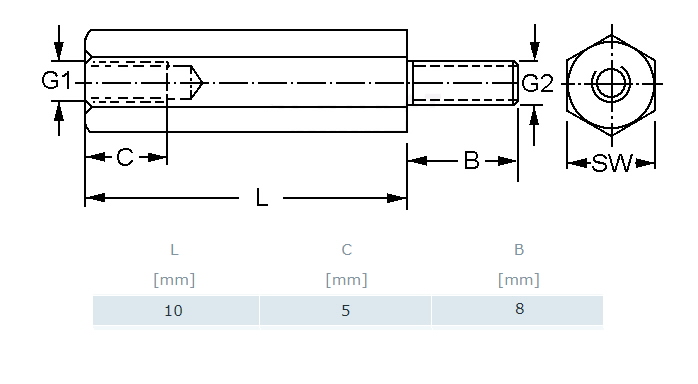 SPACER 10 mm metāla skrūve/vītne, vītnes garums 8 mm