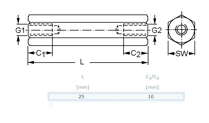 SPACER 25 mm metāls, iekšējā vītne