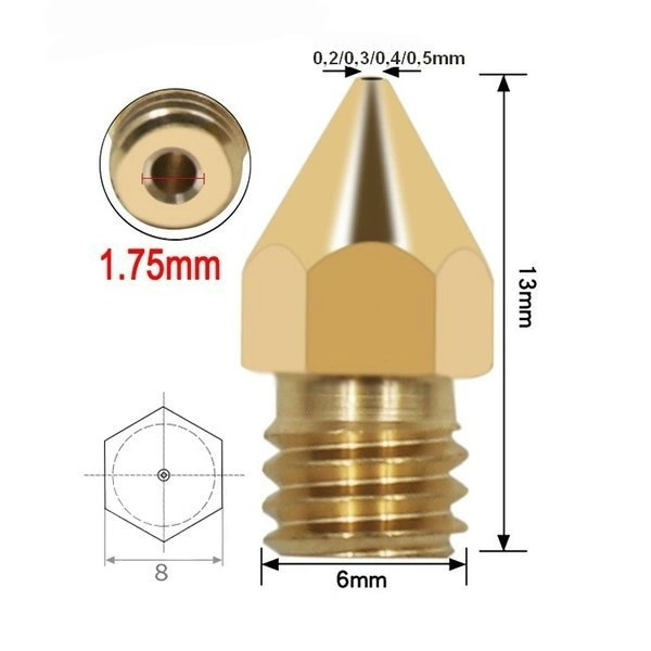 3D drukas sprauslas – 0,2/0,3/0,4/0,5 mm H13-M6 – 1,75 mm plastmasa – RepRap E3D V5 V6