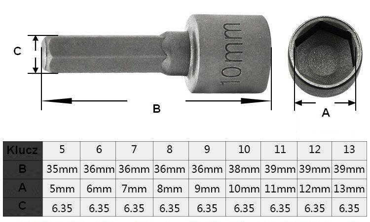 Izmērs: 5 mm, 6 mm, 7 mm, 8 mm, 9 mm, 10 mm, 11 mm, 12 mm, 13 mm