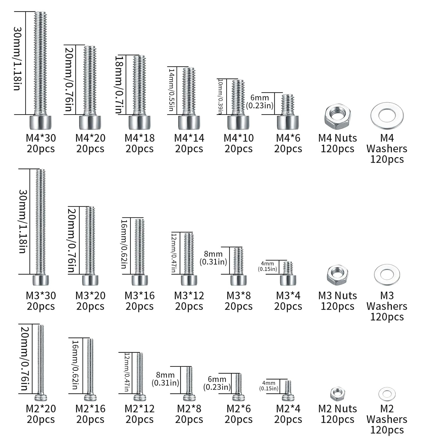 Iepakojums: 1080 gab. sešstūraini skrūves, uzgriežņi un paplāksnes, izmērs: m2x20mm, m2x16mm, m2x12mm, m2x8mm, m2x6mm, m2x6mm, m2 paplāksnes, m2 uzgriežņi, m3x30mm, m3x10mm, m3x10mm, m3x10mm x4 mm, m3 paplāksnes, m 3 uzgriežņi, m4x30mm , m4x20mm, m4x18mm, m4x14mm, m4x10mm, m4x6mm, m4 paplāksnes, m4 uzgriežņi