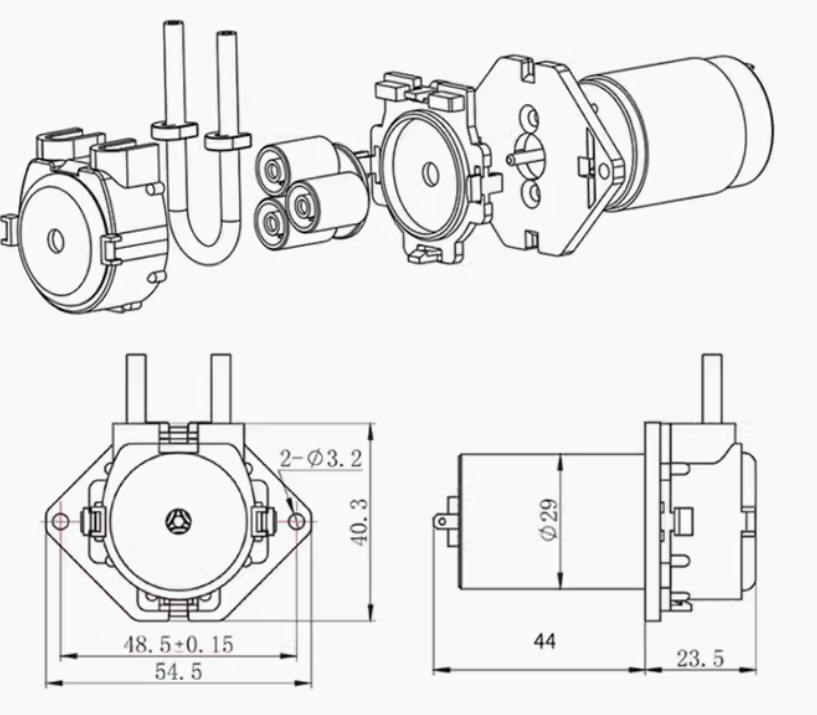✅ Tehniskie parametri* Plūsmas ātruma diapazons: 5,2–90 ml/min * Sūkņa caurules izmērs: Ø2,5 mm (iekšējais) × Ø4,5 mm (ārējais) * Spriegums: 12 V DC * Darba strāva: 0,25 A * Trokšņu līmenis: < 40 dB * Impulss: trīs veltņi, zems impulss un zems trokšņa līmenis * Sūkņa galvas materiāls: inženierijas plastmasa * Darba vide: Temperatūra 0–40 °C, relatīvais mitrums < 80 % * Montāžas plāksne: taisna montāžas plāksne✅ Funkcijas* Plaši izmanto eksperimentālajā, zinātniskajā pētniecībā un ražošanā: medicīnā, lauksaimniecībā, laboratorijās, ķīmijā utt. * Kompakts dizains ar zemu enerģijas patēriņu, pielāgojams dažādiem lietojumiem. * Šķidrums saskaras tikai ar caurulēm — nav tieša kontakta ar sūkņa korpusu — nodrošinot darbību bez piesārņojuma. * Viegla šļūtenes nomaiņa bez nepieciešamības pēc vārstiem vai blīvēm.