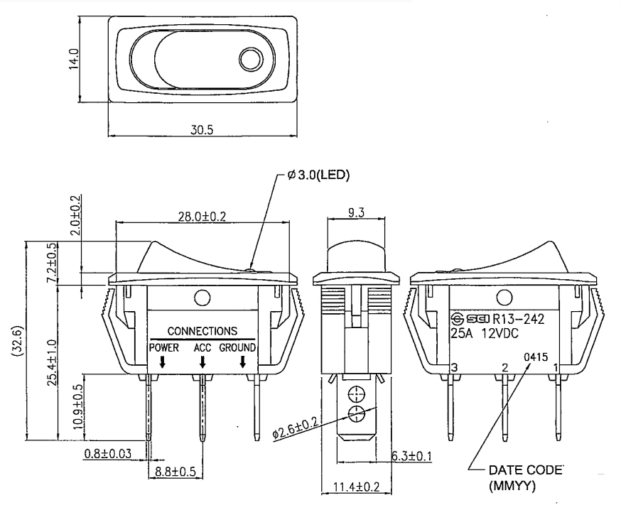 JUNGIKLIS klavišinis 25A 12VDC, su LED žalias, ON-OFF