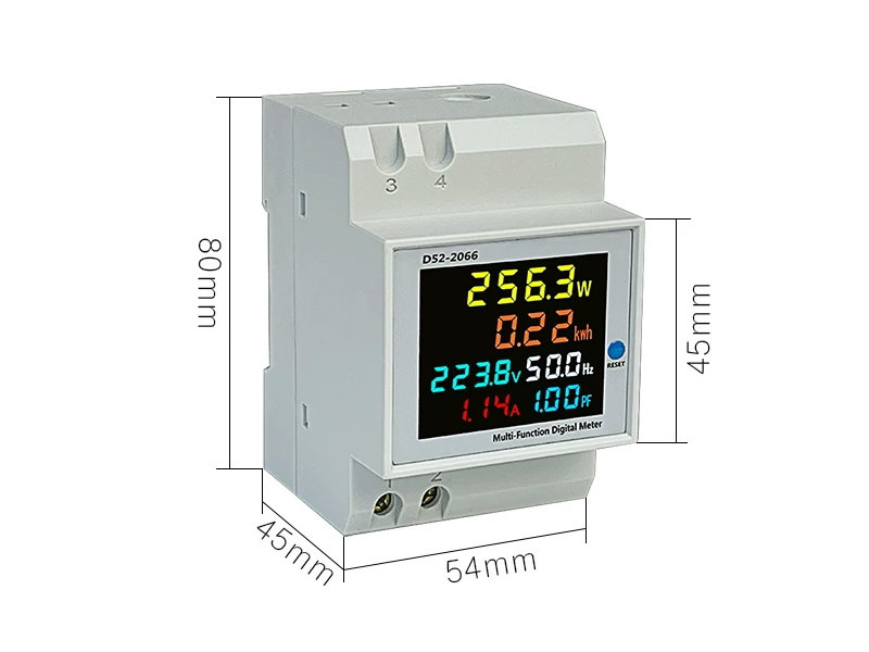 Многофункциональный измерительный прибор с цифровым дисплеем типа направляющей D52-2066 одновременно отображает на приборе 6 параметров, таких как переменное напряжение, переменный ток, активная мощность, коэффициент мощности, частота и электрическая энергия. В приборе используется цветной полноэкранный ЖК-дисплей высокой четкости для отображения результатов измерений.