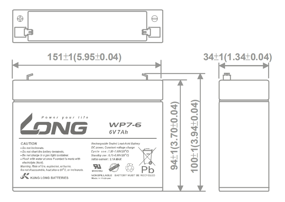 БАТАРЕЯ SLA 6V 7Ah, 150x34x94mm