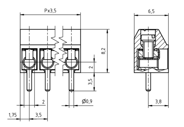 КОНТАКТНАЯ КОЛОДКА 2пина, L=3.5mm h=8.2mm W=6.5mm