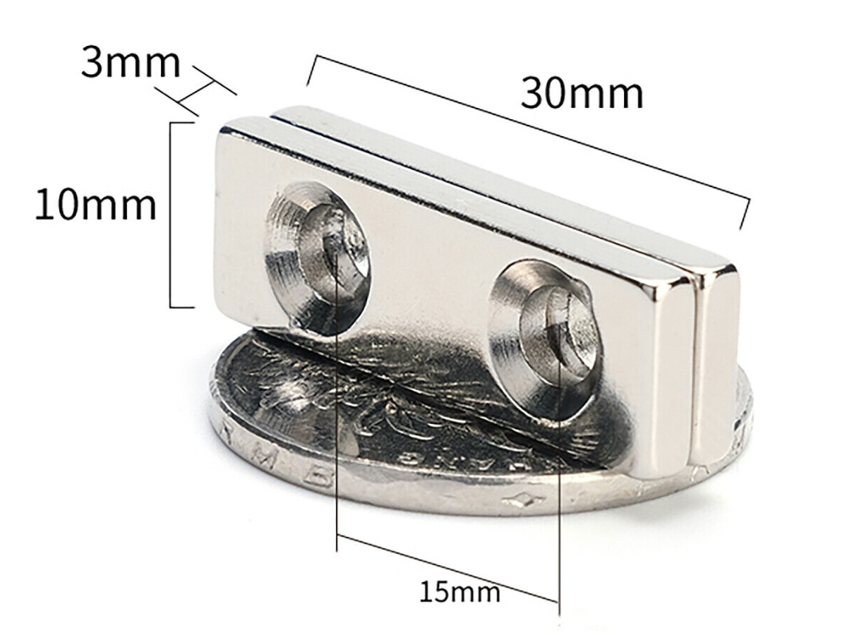 Магнит неодимовый NdFeB, 30x10x3 мм, с двумя отверстиями 4 мм