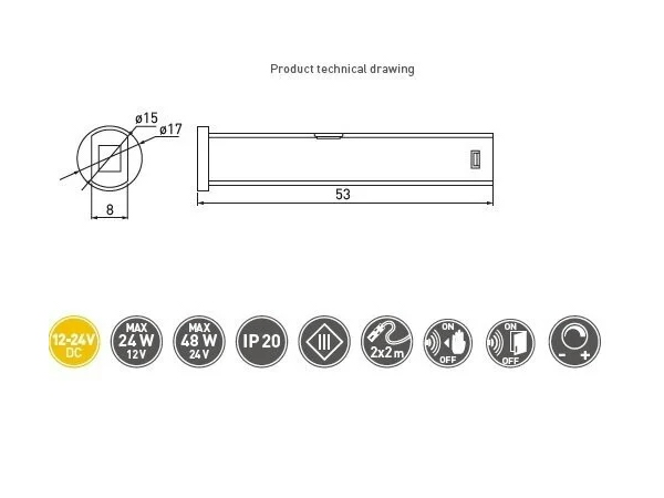 Позволяет бесконтактно активировать или деактивировать светодиодную ленту, может использоваться как бесконтактный выключатель (односкоростной датчик), бесконтактный выключатель (двухскоростной датчик) или как диммер. Выключатель можно использовать в кухонных шкафах и шкафах в спальне. Он может быть установлен двумя способами: либо приклеен внутри шкафа (односкоростной датчик), либо утоплен снаружи в шкаф (двухскоростной датчик). Для правильной работы выключателя необходимо использовать источник питания 12 В постоянного тока или 24 В постоянного тока.