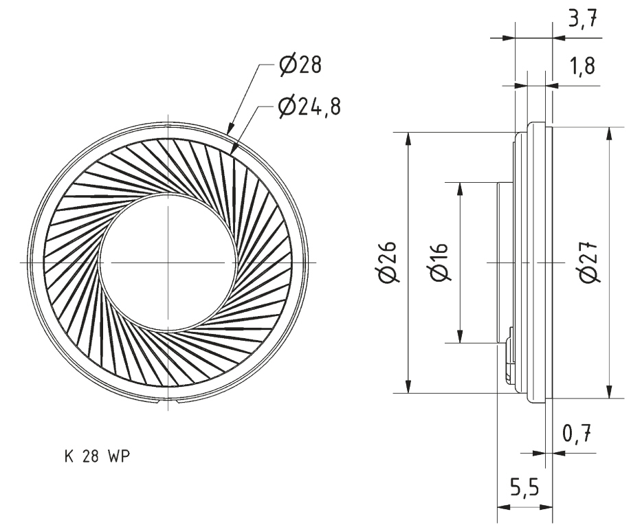 Миниатюрный динамик 2,8 см (1,1") с пластиковой мембраной (майлар). Сбалансированная частотная характеристика и хорошее воспроизведение голоса. Особенно хорошо подходит для использования в очень маленьких устройствах.