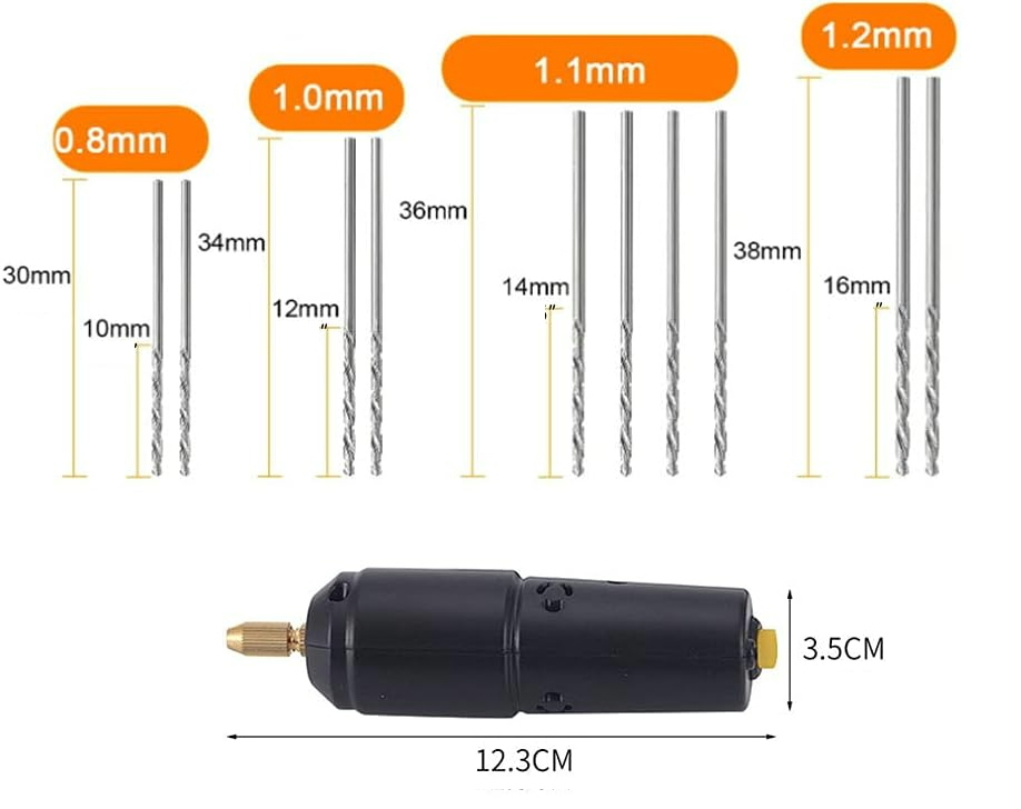 Комплект: 1 мини-дрель + 1 ключ + 10 сверл (ø0,8-1,2 мм)