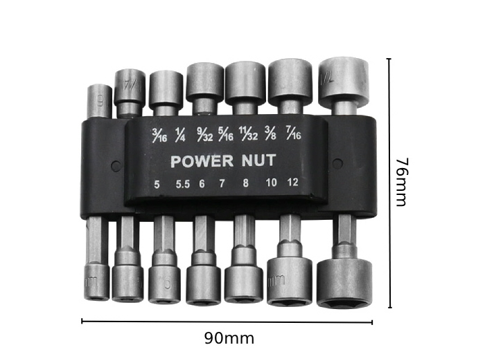 - Размеры: метрические (5 мм, 5,5 мм, 6 мм, 7 мм, 8 мм, 10 мм, 12 мм) и дюймовые (3/16", 1/4", 9/32", 5/16", 11/32", 3/8", 7/16")