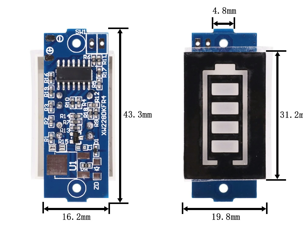 The single cell battery capacity indicator provides a quick visual indication of the state of charge (capacity) of 18650 Li-ion batteries and other lithium batteries with a maximum voltage of 4.2 volts. This indicator is perfect for DIY power supplies, battery chargers, RC and electric models to quickly and easily read the battery charge status.