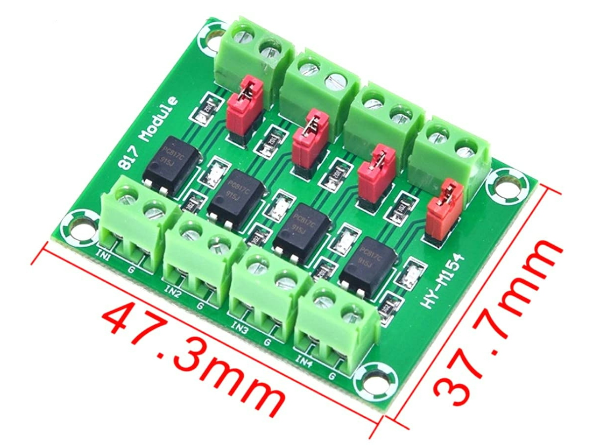 ⭐ Galvenās funkcijas* 🔌 4 neatkarīgi kanāli (viens PC817 uz kanālu). * ⚡ Dzinēja (ieejas) signāla spriegums: 3,6–24 V. * ⚙️ Izejas puses sprieguma diapazons: 3,6–30 V. * 🔁 Impulsa signāla ierobežojums: ieteicams < 4 kHz (augstāka frekvence var nedarboties uzticami). * 🎚️ Ar džemperi izvēlējamais izejas tips: “augsts potenciāls” (pull‑up) vai “pull‑down / zems izejas signāls”. * 🧩 Ieejas puse dala GND, bet izejas kanāli ir elektriski neatkarīgi, ļaujot vienlaikus izmantot vairākus izejas spriegumus (plates robežās).--------------------