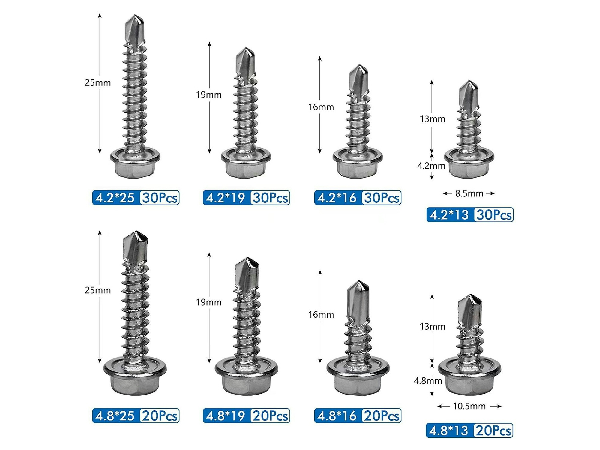 Šis 200 gab. pašvītņojošo sešstūra skrūvju klāsts ir ideāli piemērots biezāku metālu savienošanai ar metālu. Izgatavotas no nerūsējošā tērauda, kas nodrošina izturību pret koroziju.